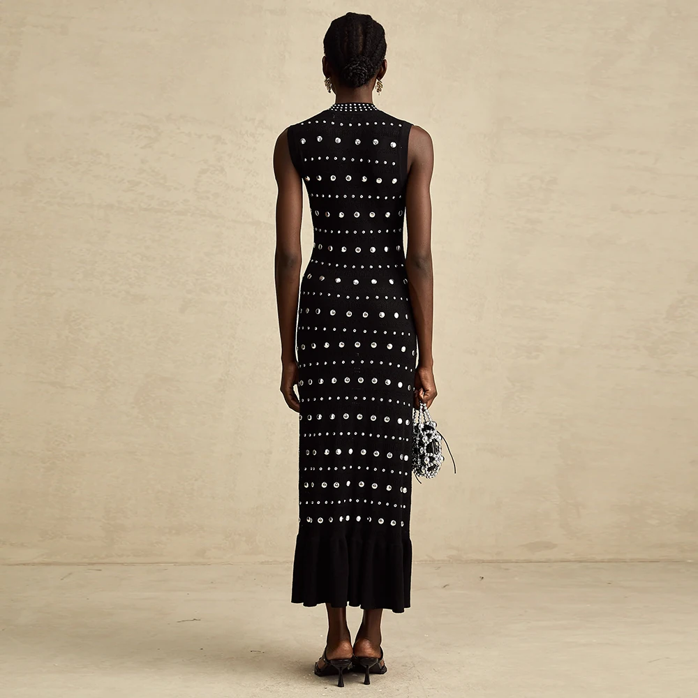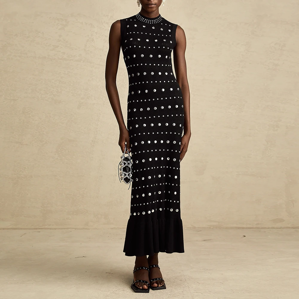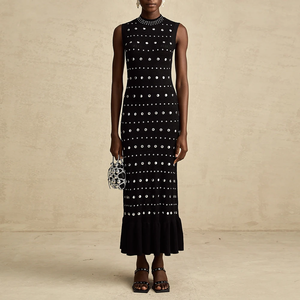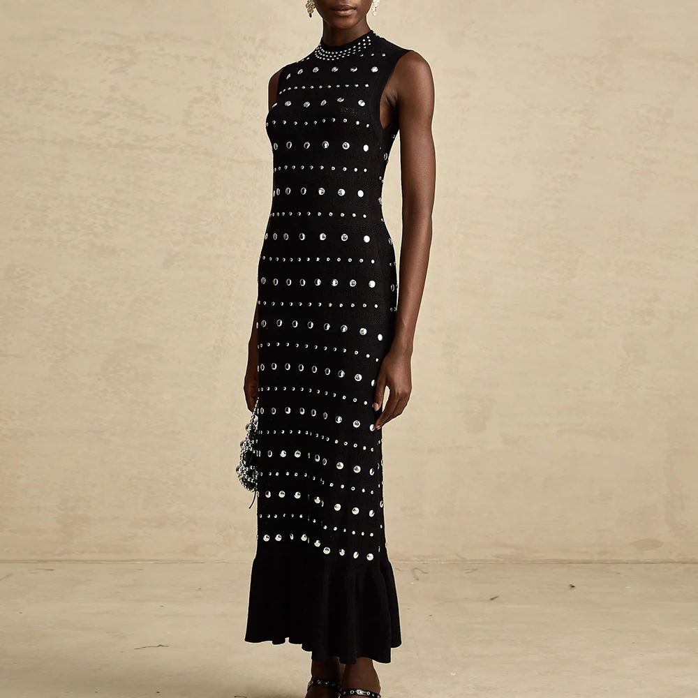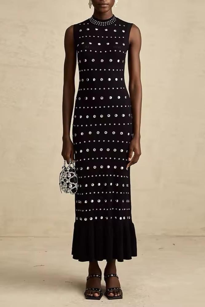 تألقي بإطلالة ساحرة مع فستان أسود طويل بتصميم كلاسيكي راقٍ مزين بالاحجار المعدنية البراقة، لإضافة لمسة من الفخامة والأنوثة. يتميز هذا الفستان بقصّة ضيقة انسيابية تبرز جمال القوام، مع كشكش أنيق في الحافة ليمنحك إطلالة جذابة.