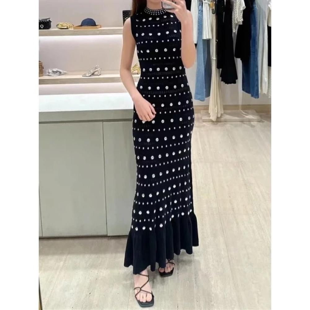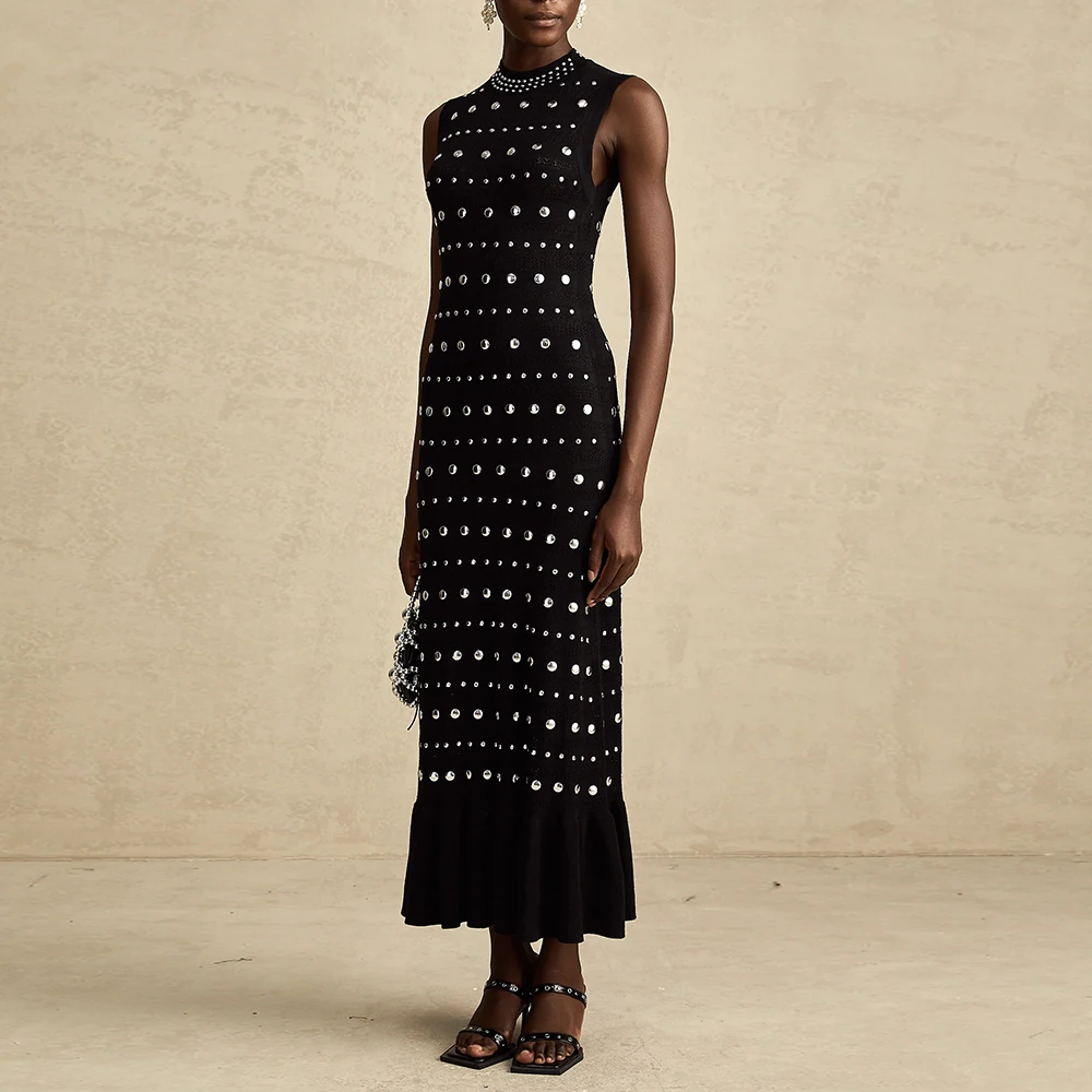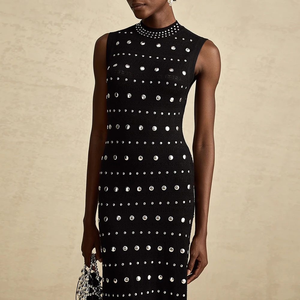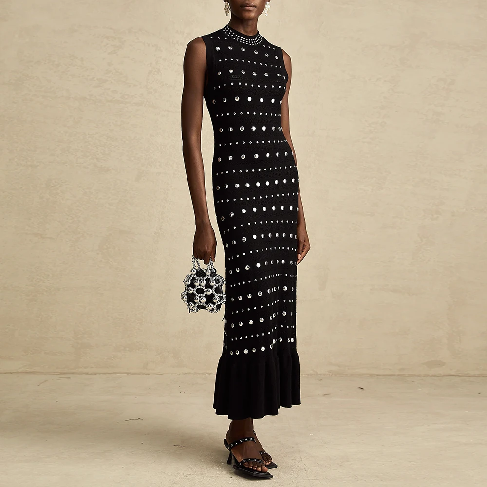 تألقي بإطلالة ساحرة مع فستان أسود طويل بتصميم كلاسيكي راقٍ مزين بالاحجار المعدنية البراقة، لإضافة لمسة من الفخامة والأنوثة. يتميز هذا الفستان بقصّة ضيقة انسيابية تبرز جمال القوام، مع كشكش أنيق في الحافة ليمنحك إطلالة جذابة.