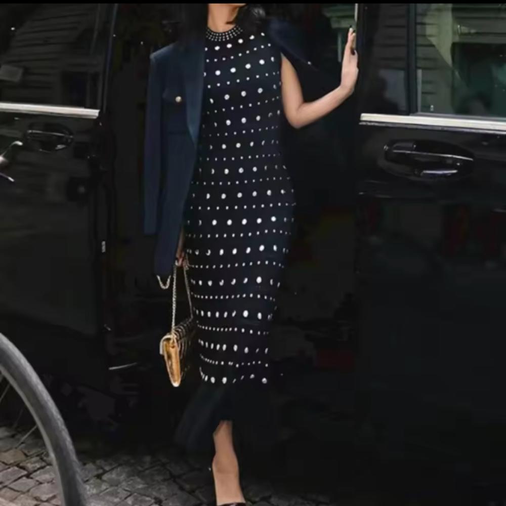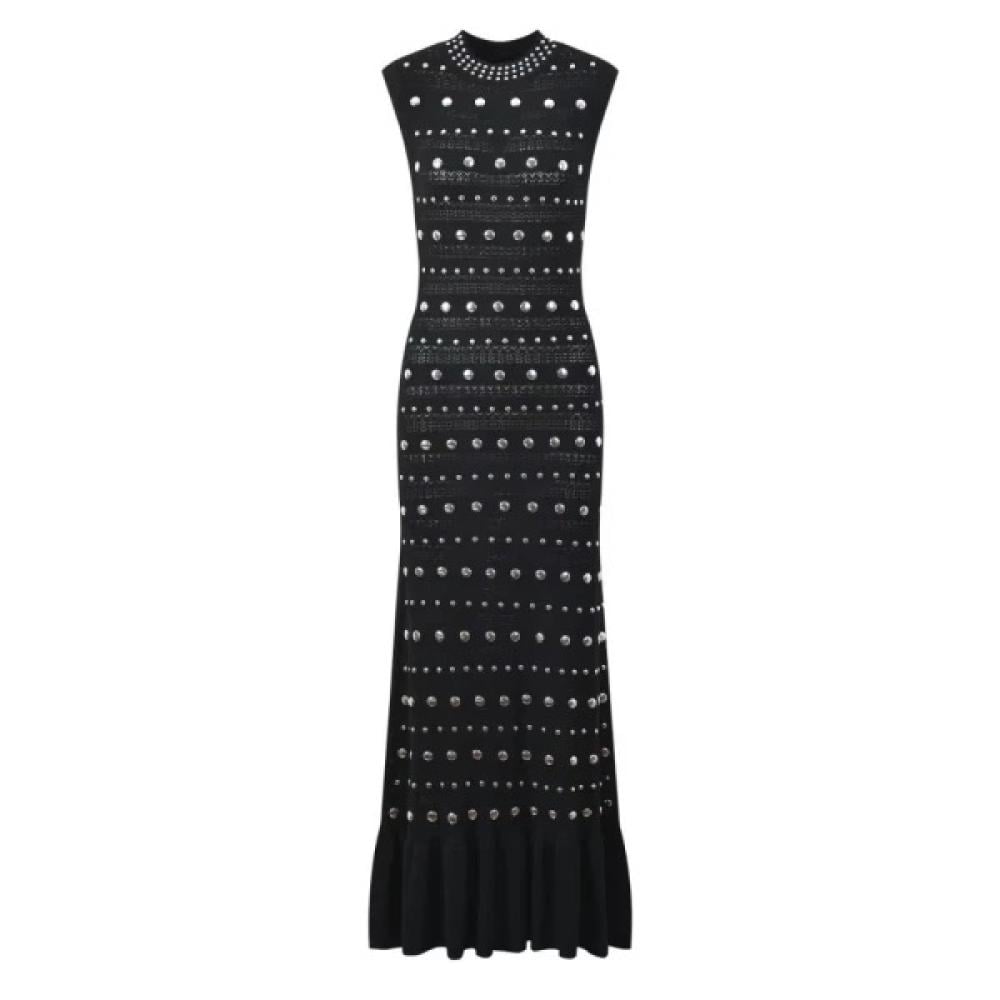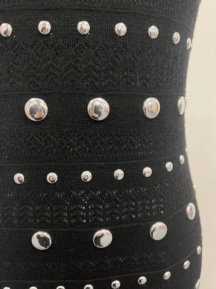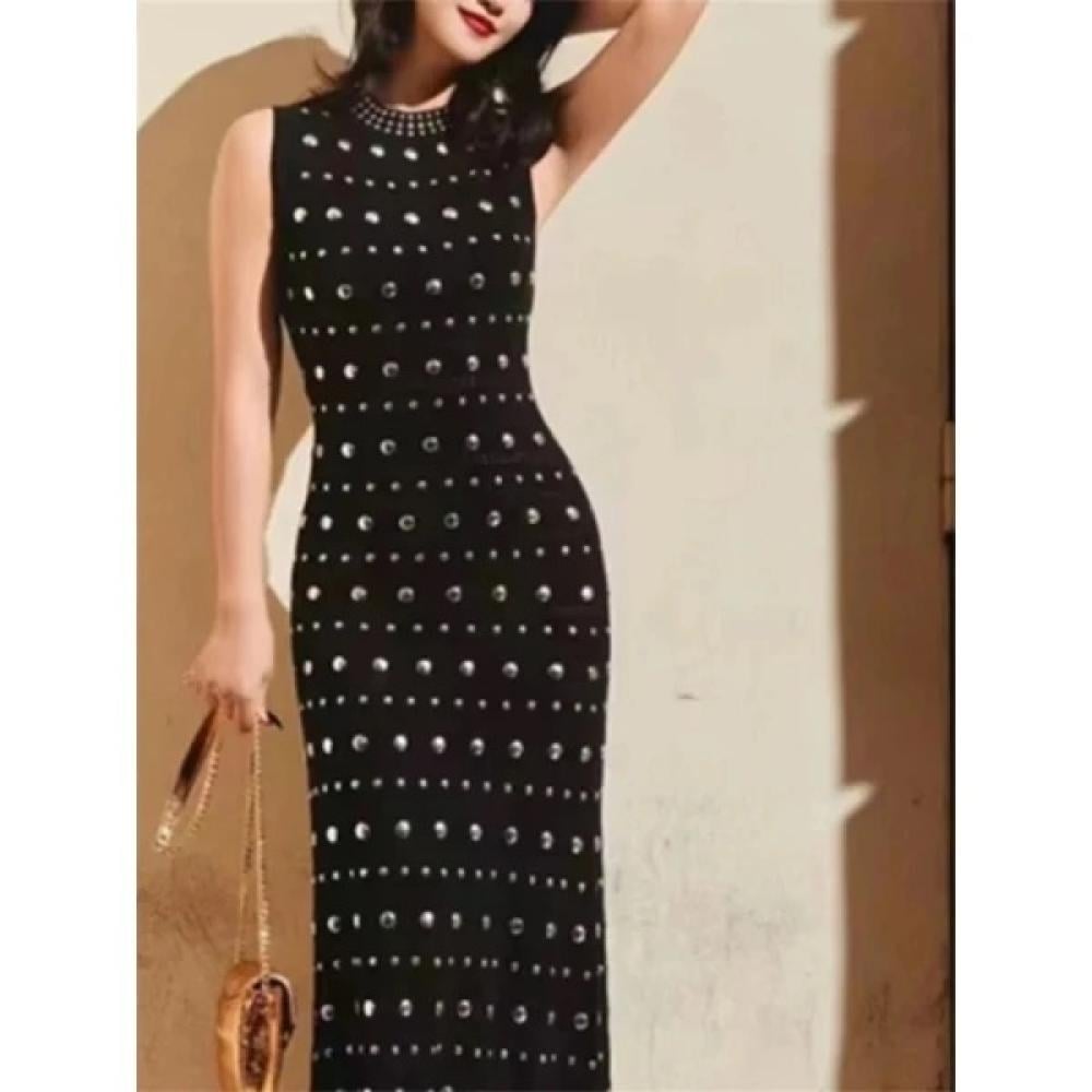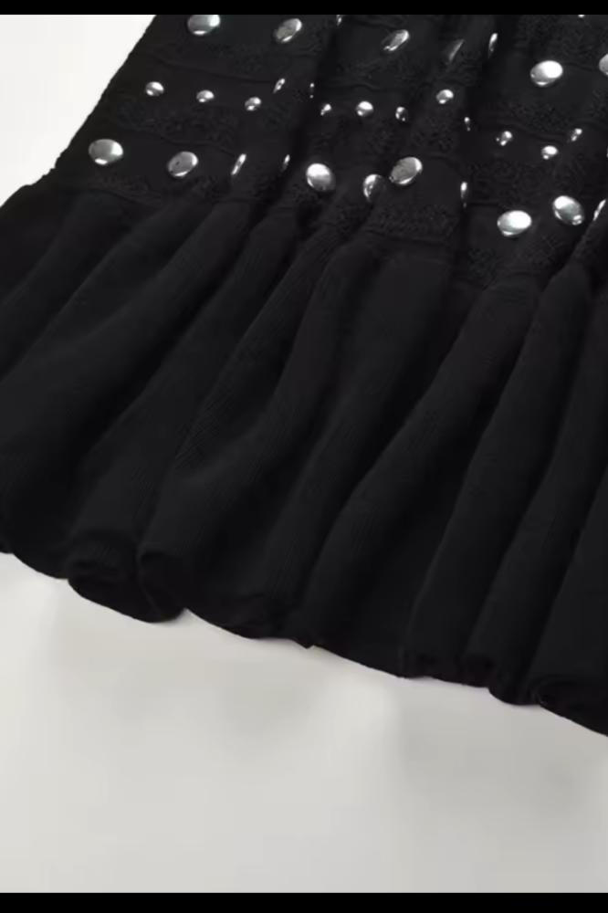 تألقي بإطلالة ساحرة مع فستان أسود طويل بتصميم كلاسيكي راقٍ مزين بالاحجار المعدنية البراقة، لإضافة لمسة من الفخامة والأنوثة. يتميز هذا الفستان بقصّة ضيقة انسيابية تبرز جمال القوام، مع كشكش أنيق في الحافة ليمنحك إطلالة جذابة.