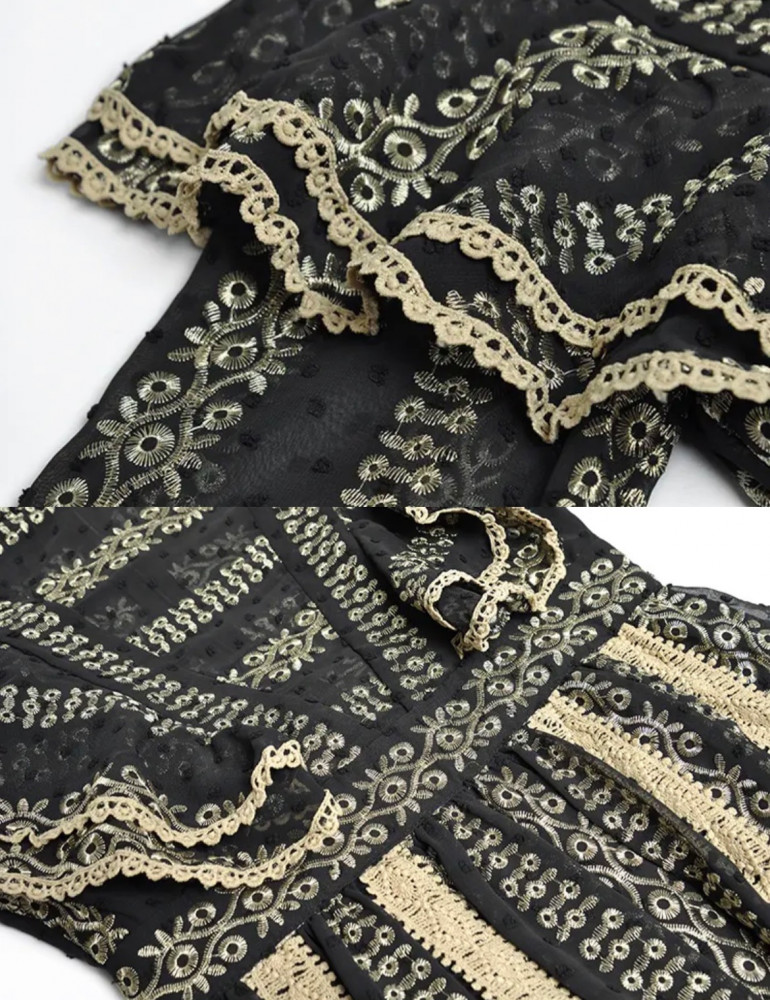 فستان أسود طويل مطرز باللون البيج