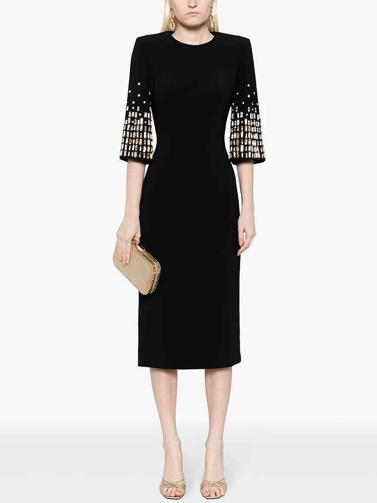 • أكمام متوسطة الطول مزينة بتفاصيل كريستالية براقة لمظهر فخم.
