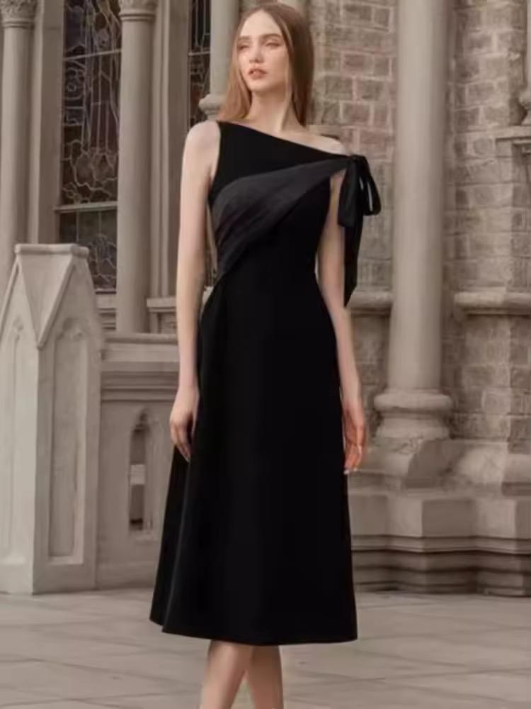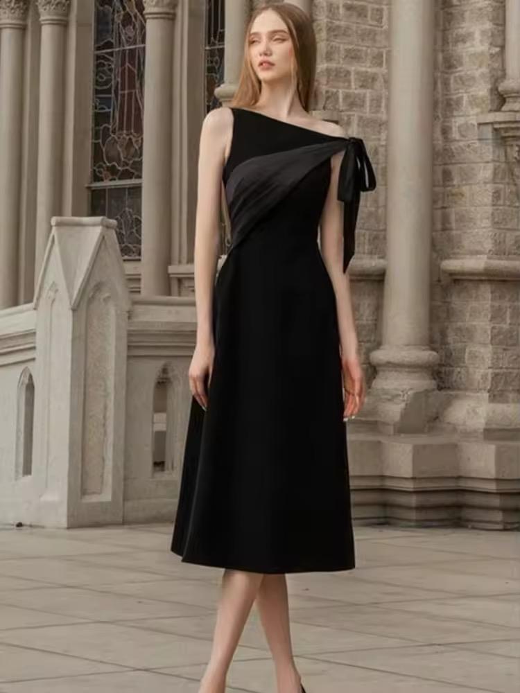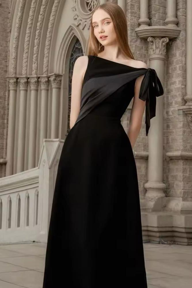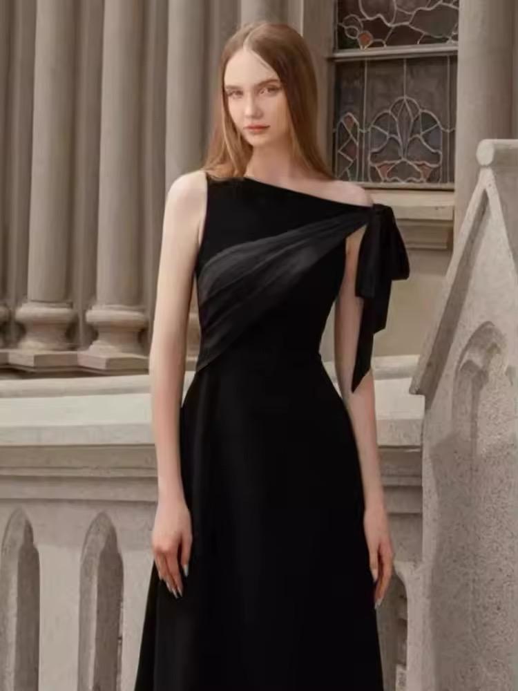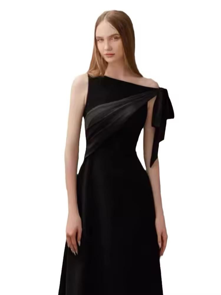 فستان أسود أنيق بتصميم راقٍ وعصري يناسب المناسبات الفاخرة. يتميز الفستان بقصة غير متماثلة (One Shoulder) حيث يكشف عن كتف واحدة مع تفاصيل قماشية أنيقة تمتد على الكتف الآخر مع عقدة جذابة تعزز من جمال التصميم.