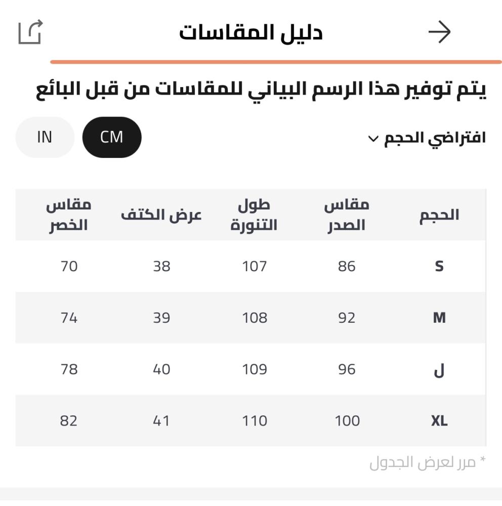 M: الكتف: 39 سم، الصدر: 92 سم، الخصر: 74 سم، طول الكم: 63 سم، الطول: 108 سم