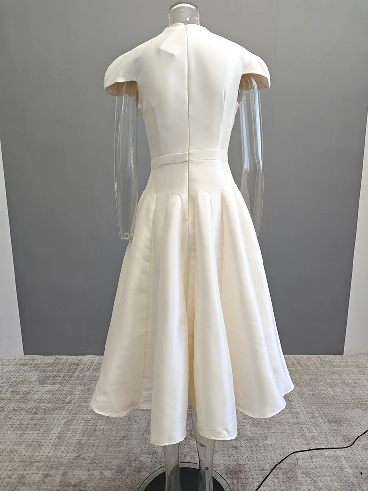 فستان سهرة أنيق بلون أوف وايت، يتميز بتصميم كلاسـيكي عصري بقصة A-line تضفي لمسة راقية وأنثوية. مصنوع من قماش فاخر بتصميم ناعم وانسيابي، مزود بأكمام قصيرة مع فتحة ياقة أنيقة تعزز من جمالية التصميم. مثالي للمناسبات الرسمية والسهرات وحفلات الزفاف. يتميز بقصة متوسطة الطول تضفي طابعًا ملكيًا أنيقًا، مع خياطة دقيقة تمنح إطلالة فاخرة ومتميزة.