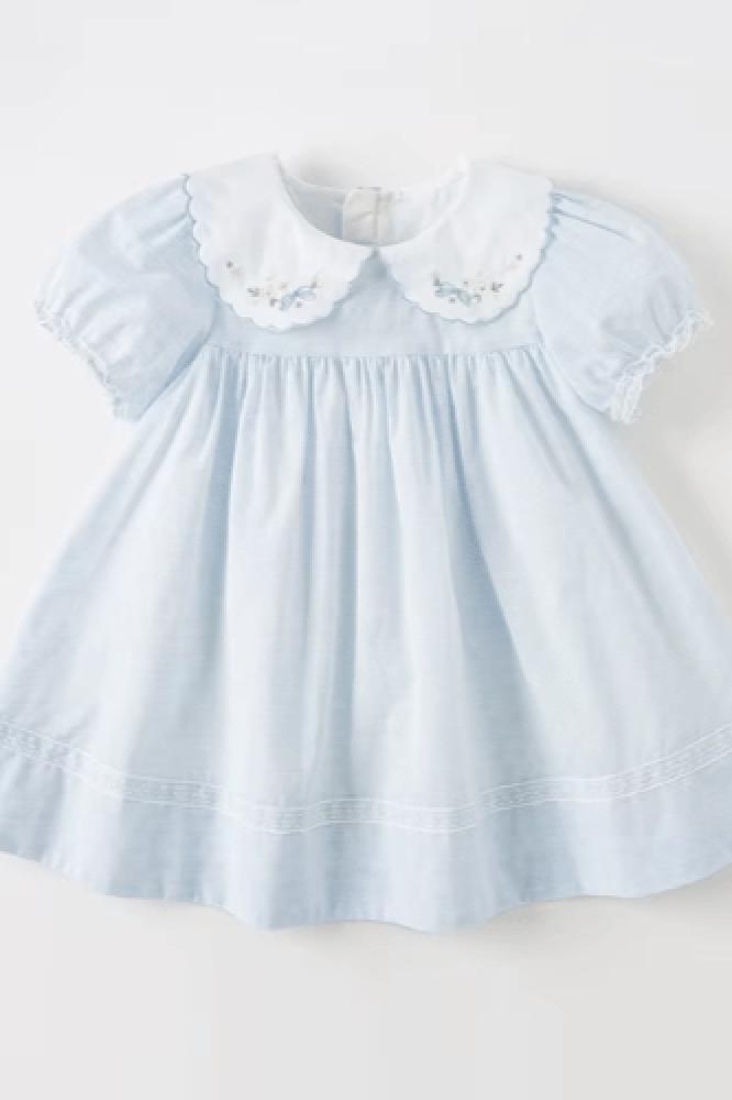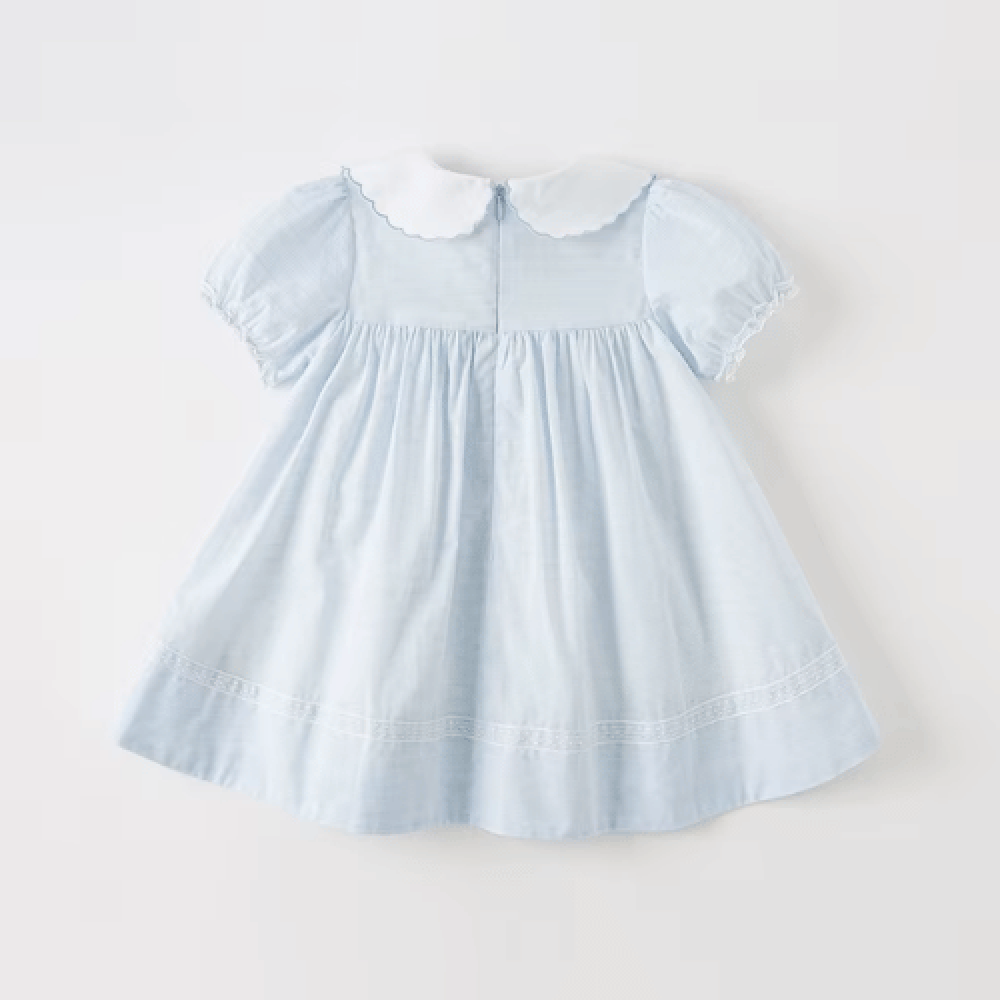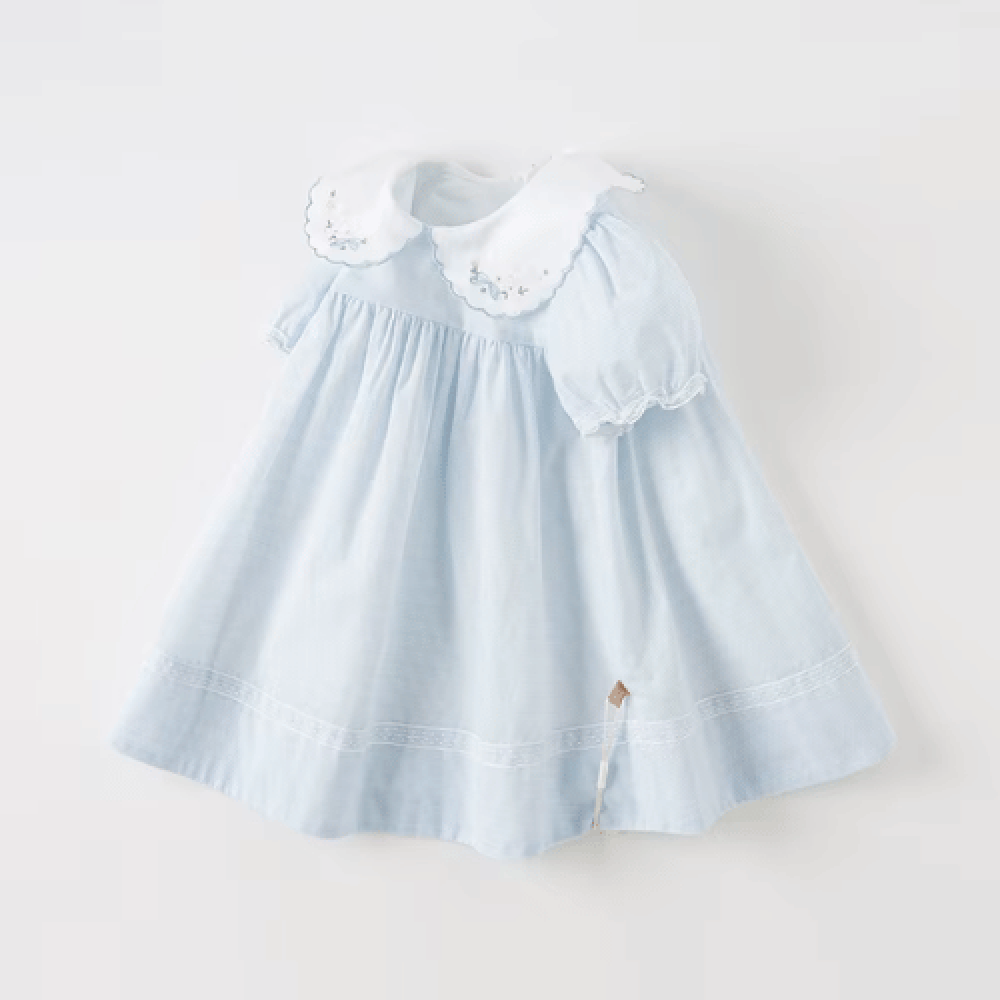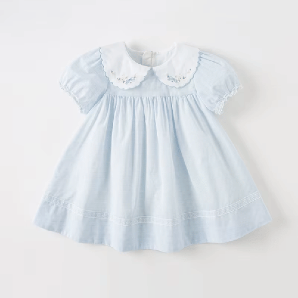 ياقة بيتر بان الكلاسيكية: تمنح الفستان طابعًا عصريًا ومظهرًا راقيًا.