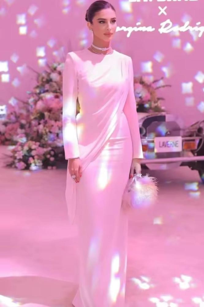 احصلي على إطلالة راقية وساحرة مع هذا الفستان الطويل الوردي الفاتح، المصمم بقصة ضيقة تبرز جمال القوام مع لمسة درييب ناعمة على الخصر لمظهر أنثوي راقٍ. يتميز بأكمام طويلة تضيف فخامة وأناقة، وهو مثالي للمناسبات الفاخرة مثل الأعراس، السهرات، والخطوبة.