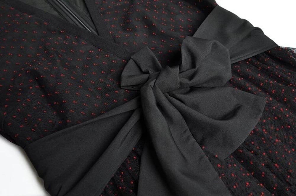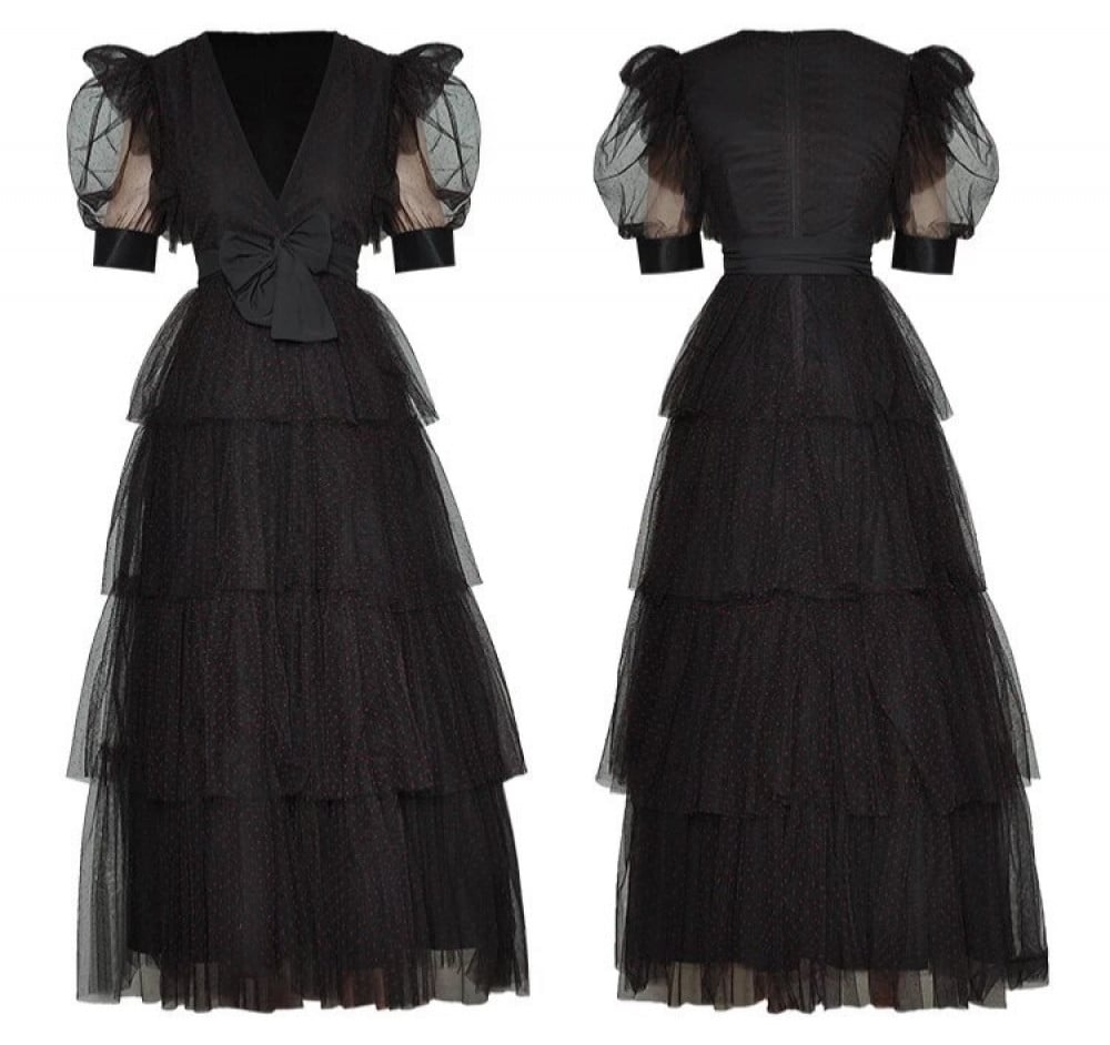 فستان طويل مزين بطبقات من التل المنقط
