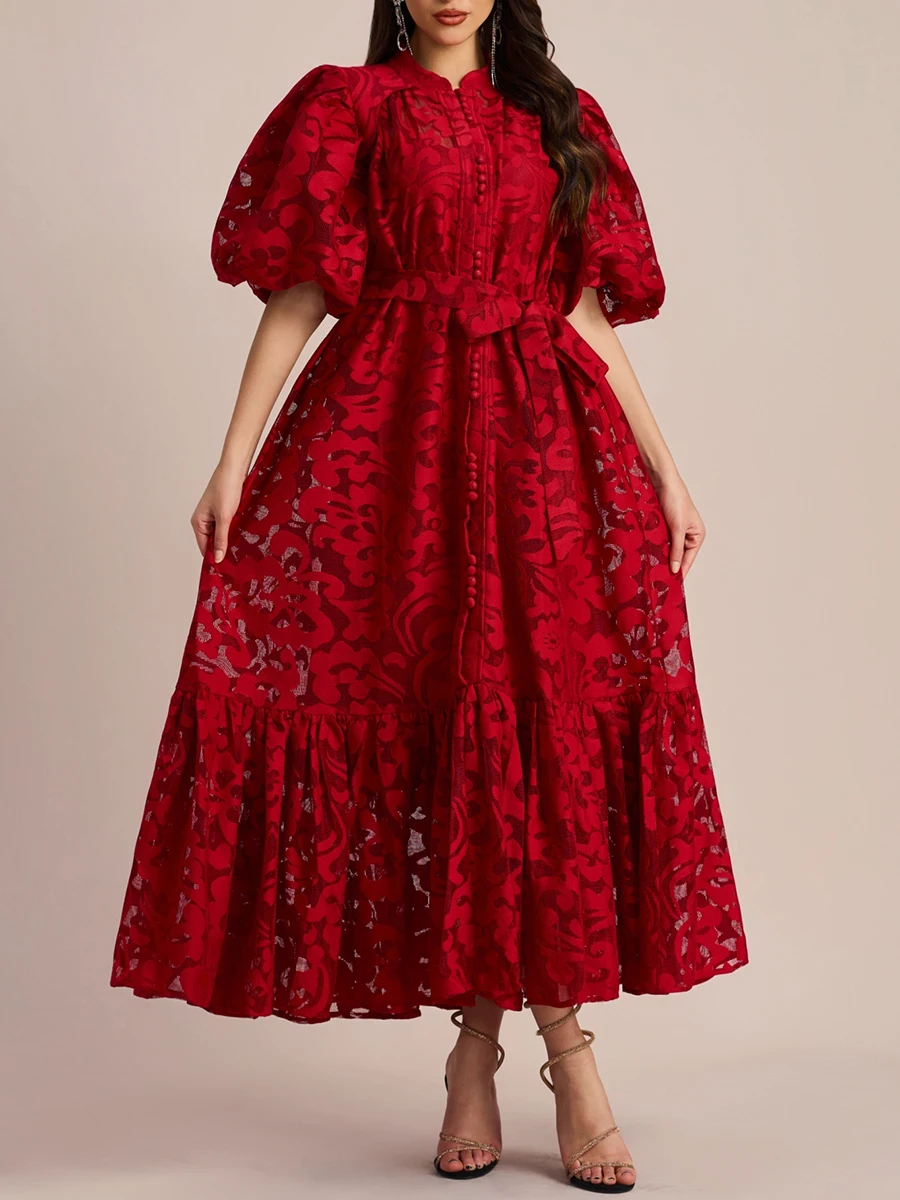 ✔ التصميم: فستان طويل مزود بأكمام منفوخة لمظهر أنثوي جذاب، مع حزام على الخصر لإبراز القوام بشكل مثالي.