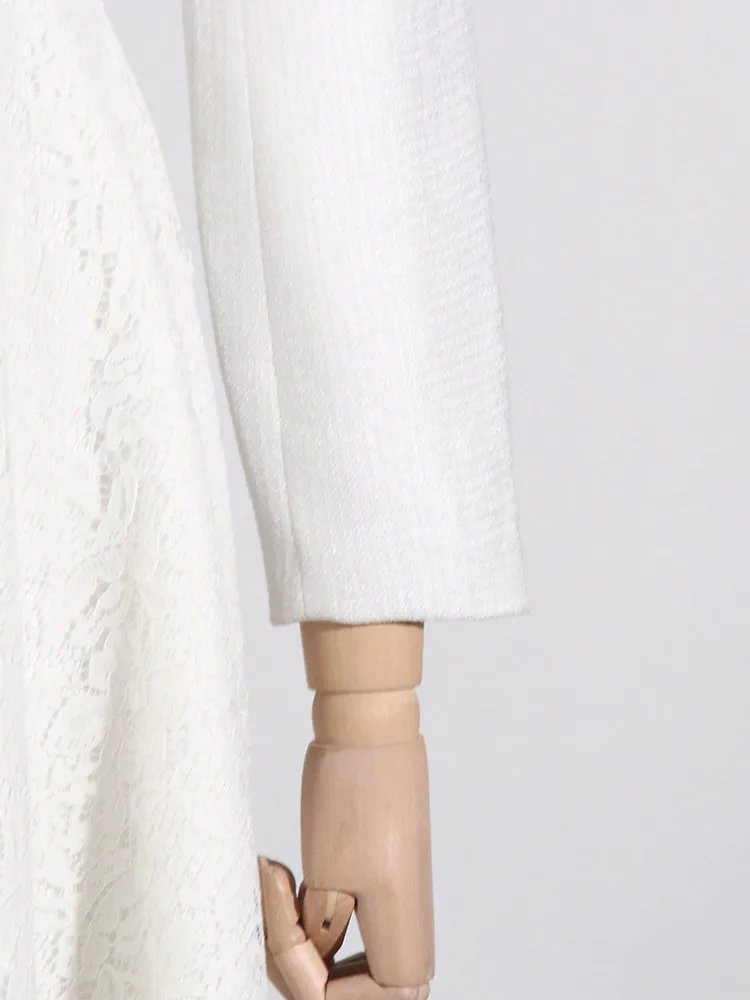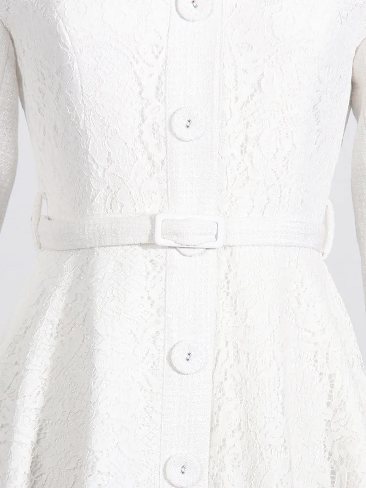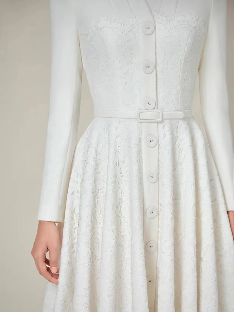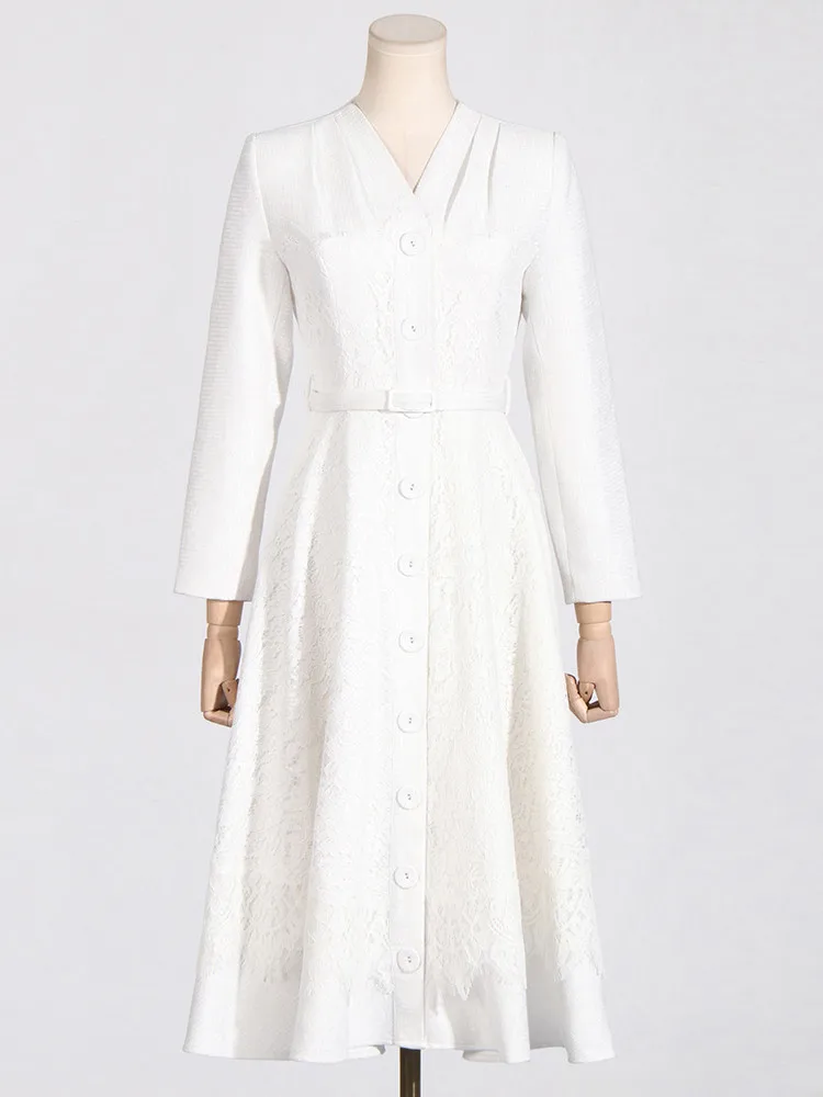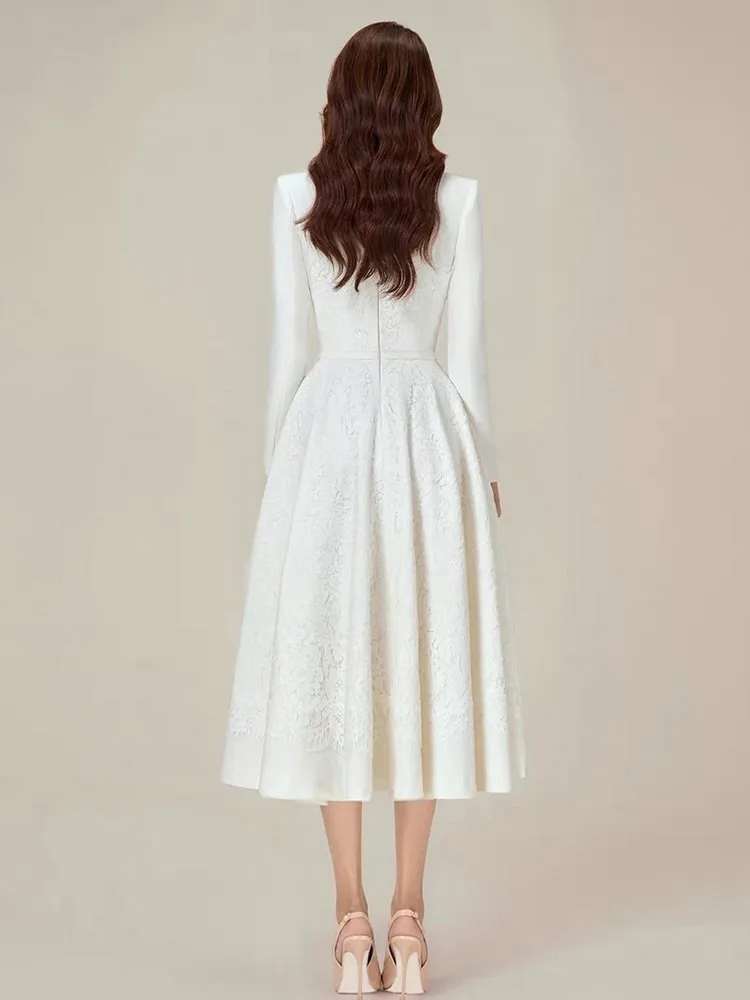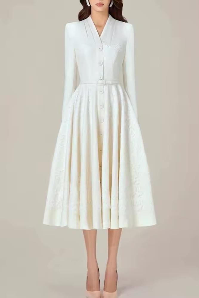 فستان أنيق باللون الأبيض يجمع بين الفخامة والرقي بتصميم كلاسيكي عصري. يتميز الفستان بياقة على شكل V وأكمام طويلة تضفي عليه لمسة من الأناقة الرسمية. يأتي مزينًا بأزرار أمامية ممتدة على طول التصميم، مما يعزز من طابعه الراقي. كما يدمج الفستان بين القماش الناعم والتطريزات الراقية التي تضيف لمسة أنثوية فاخرة.