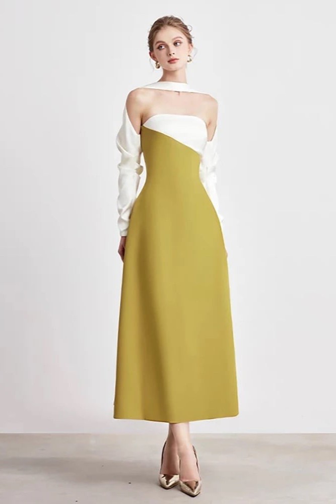 الفستان بقصة ضيقة تبرز جمال القوام بشكل أنيق، مع خصر محدد يضيف للإطلالة طابعًا مميزًا. الفستان بياقة كلاسيكية ، وتعزز هذه التفاصيل الصغيرة جاذبية التصميم بشكل فريد.