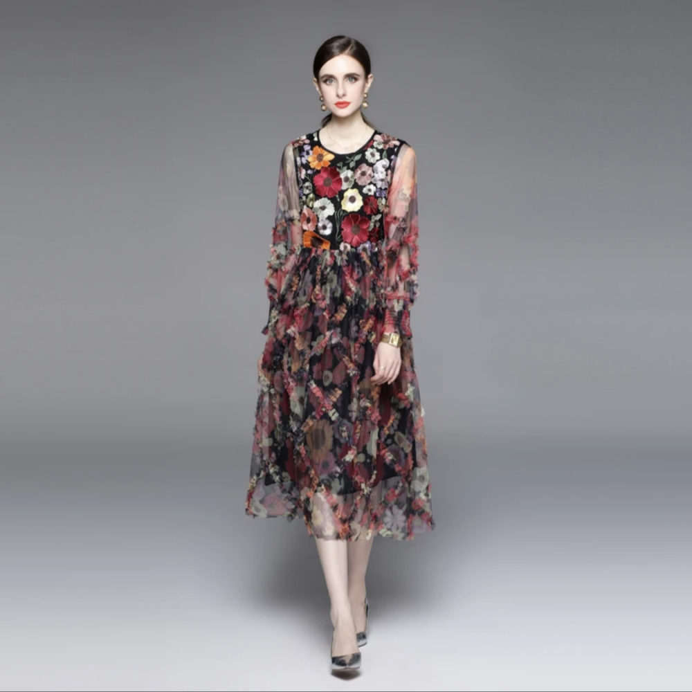 فستان نسائي أنيق من التل مطرز بالزهور وبأكمام منفوخة