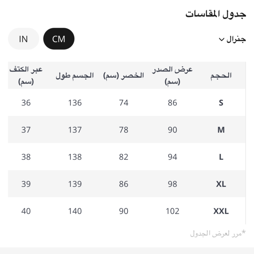 جدول المقاسات مرفق مع الصور