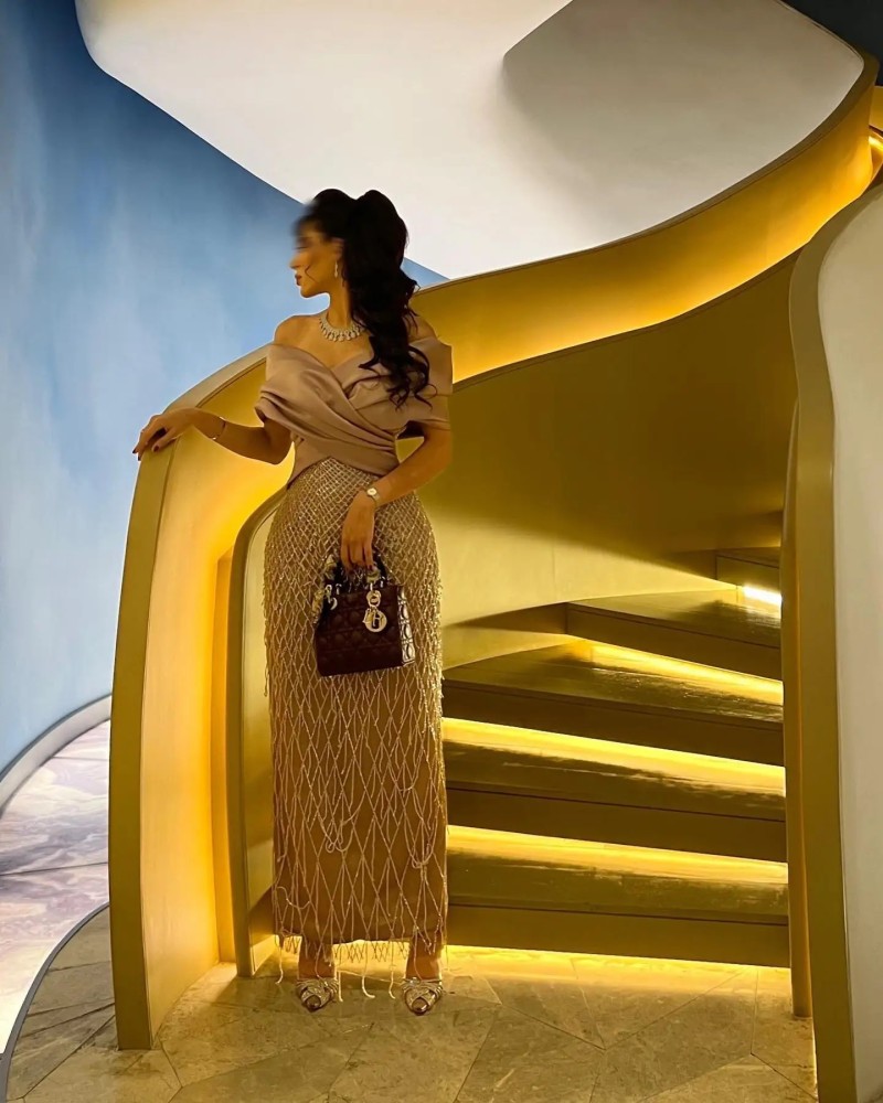 الفستان بقصة ضيقة تبرز جمال القوام بشكل أنيق، مع خصر محدد يضيف للإطلالة طابعًا مميزًا. الفستان بياقة كلاسيكية ، وتعزز هذه التفاصيل الصغيرة جاذبية التصميم بشكل فريد.