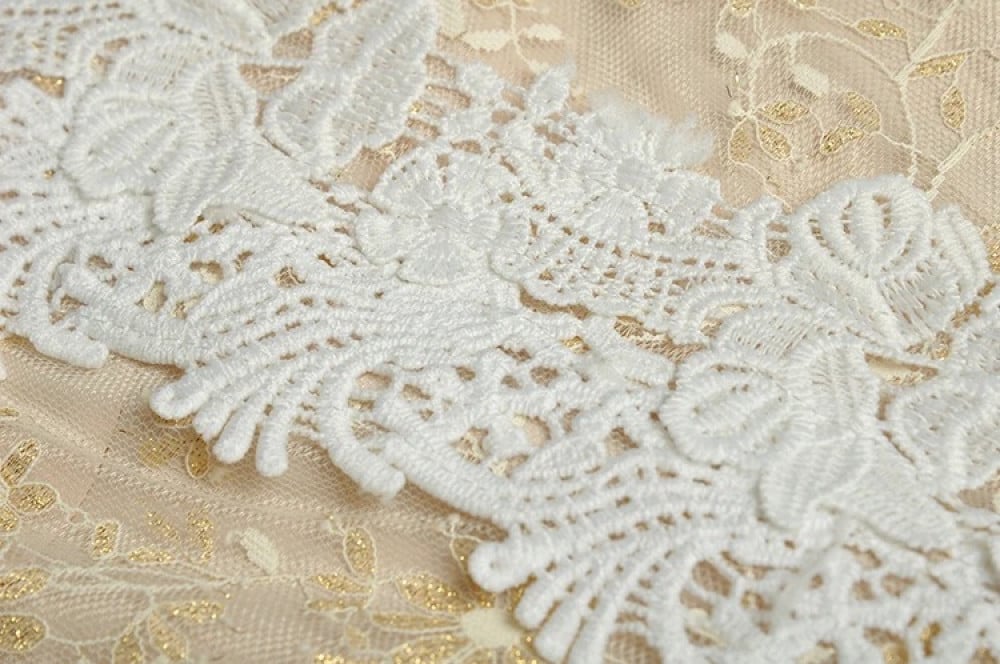 فستان بيج طويل مزين بشرائط من الدانتيل