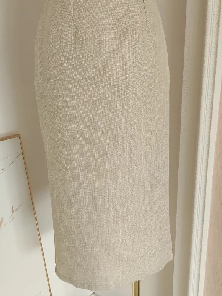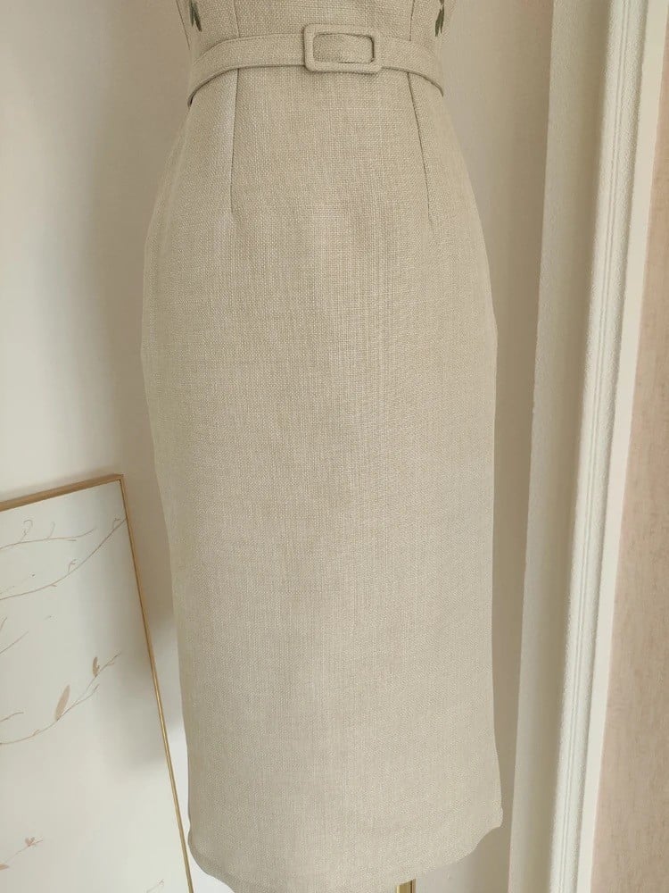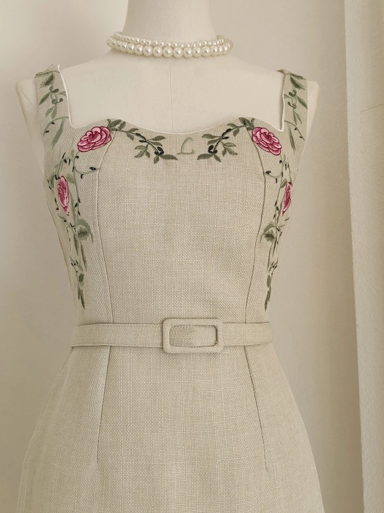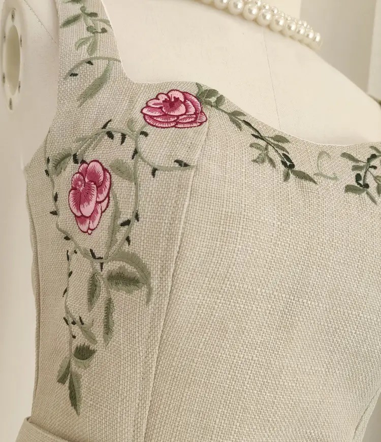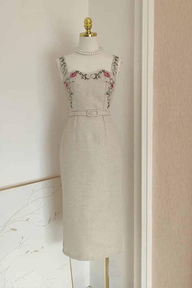 الفستان بقصة ضيقة تبرز جمال القوام بشكل أنيق، مع خصر محدد يضيف للإطلالة طابعًا مميزًا.صدر الفستان مطرز بالزهور وتعزز هذه التفاصيل الصغيرة جاذبية التصميم بشكل فريد.