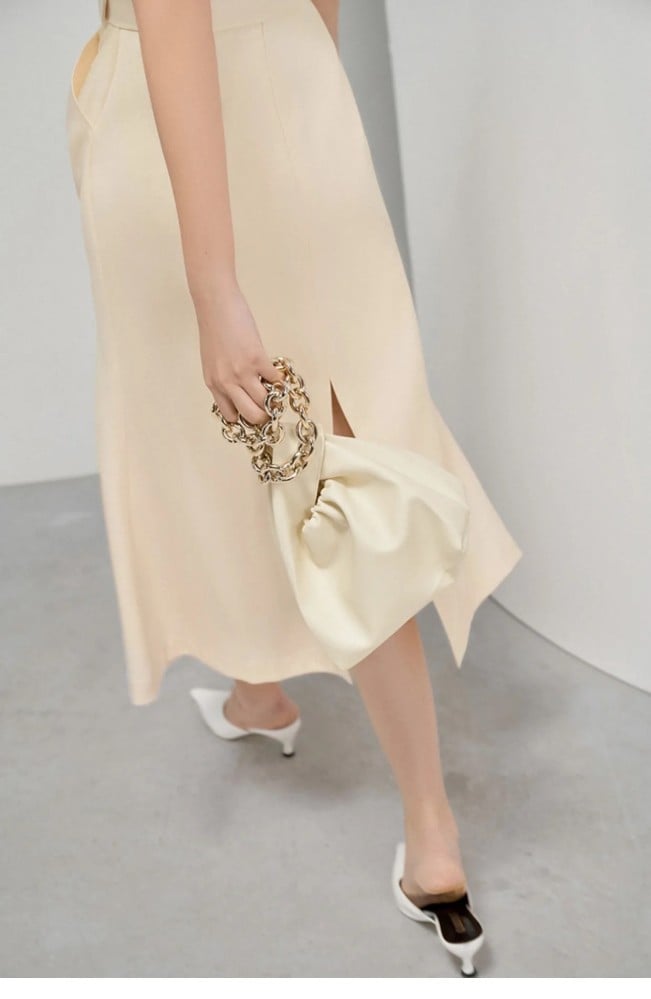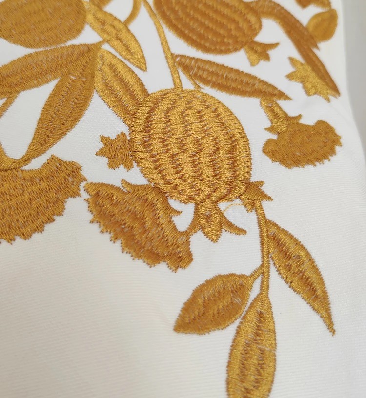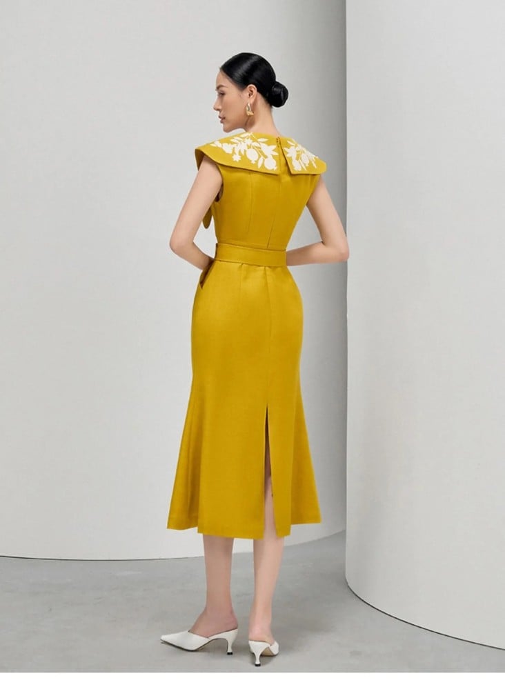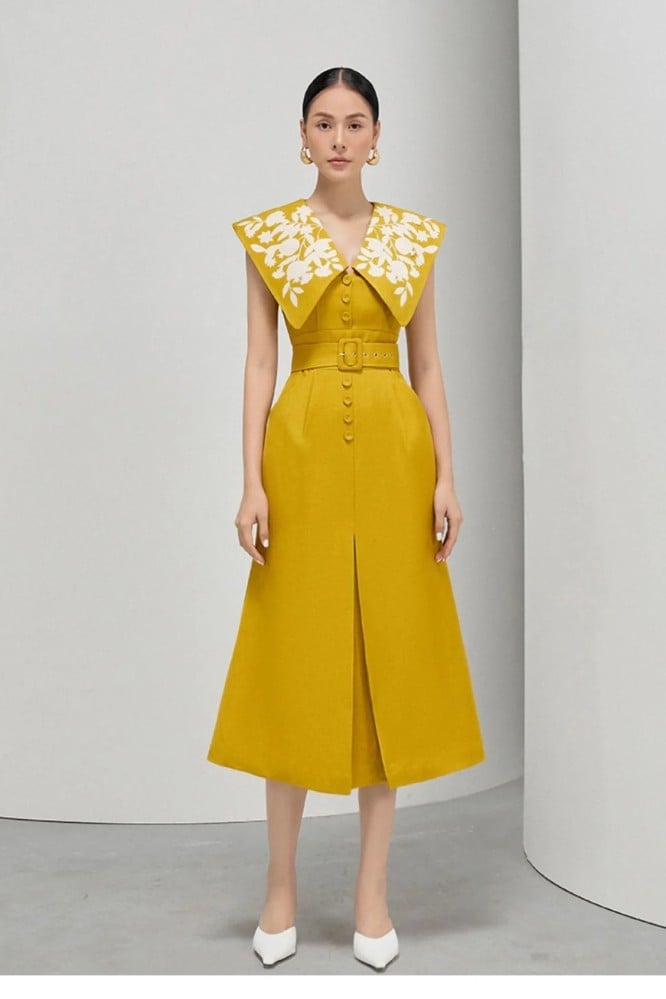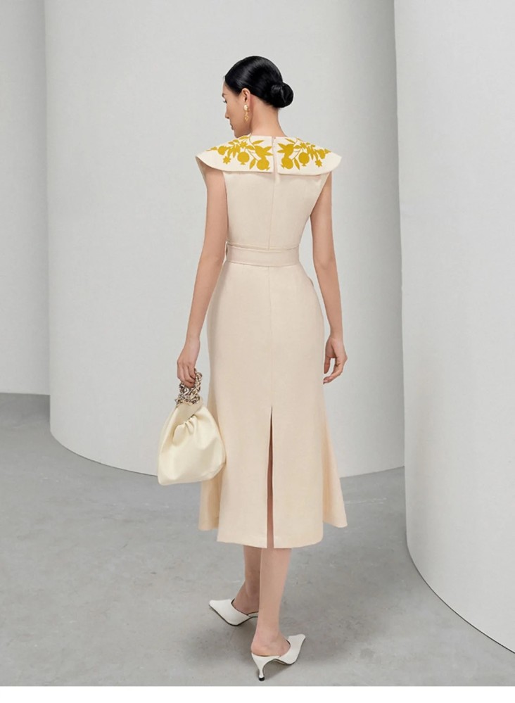 يتميز الفستان بالتصميم الأنيق البسيط مع لمسات فنية ليجسد الرقي والرقة.