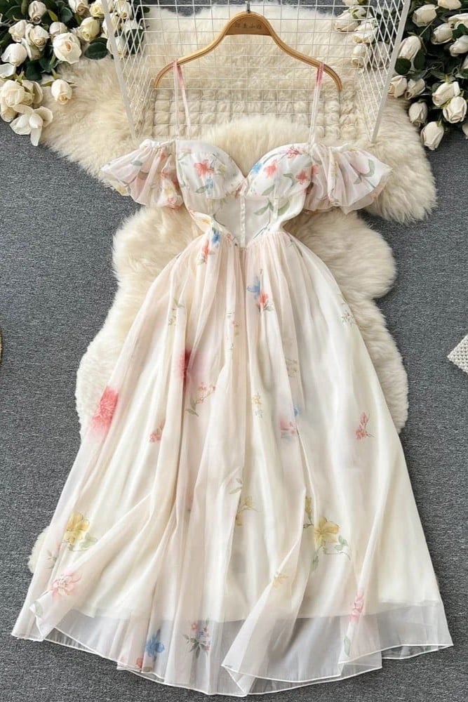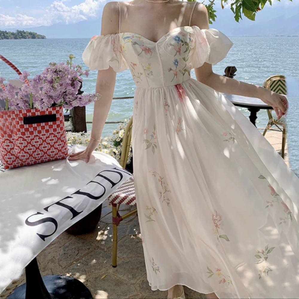 فستان نسائي أنيق من الكتان مشجر بالزهور وبأكمام منفوخة