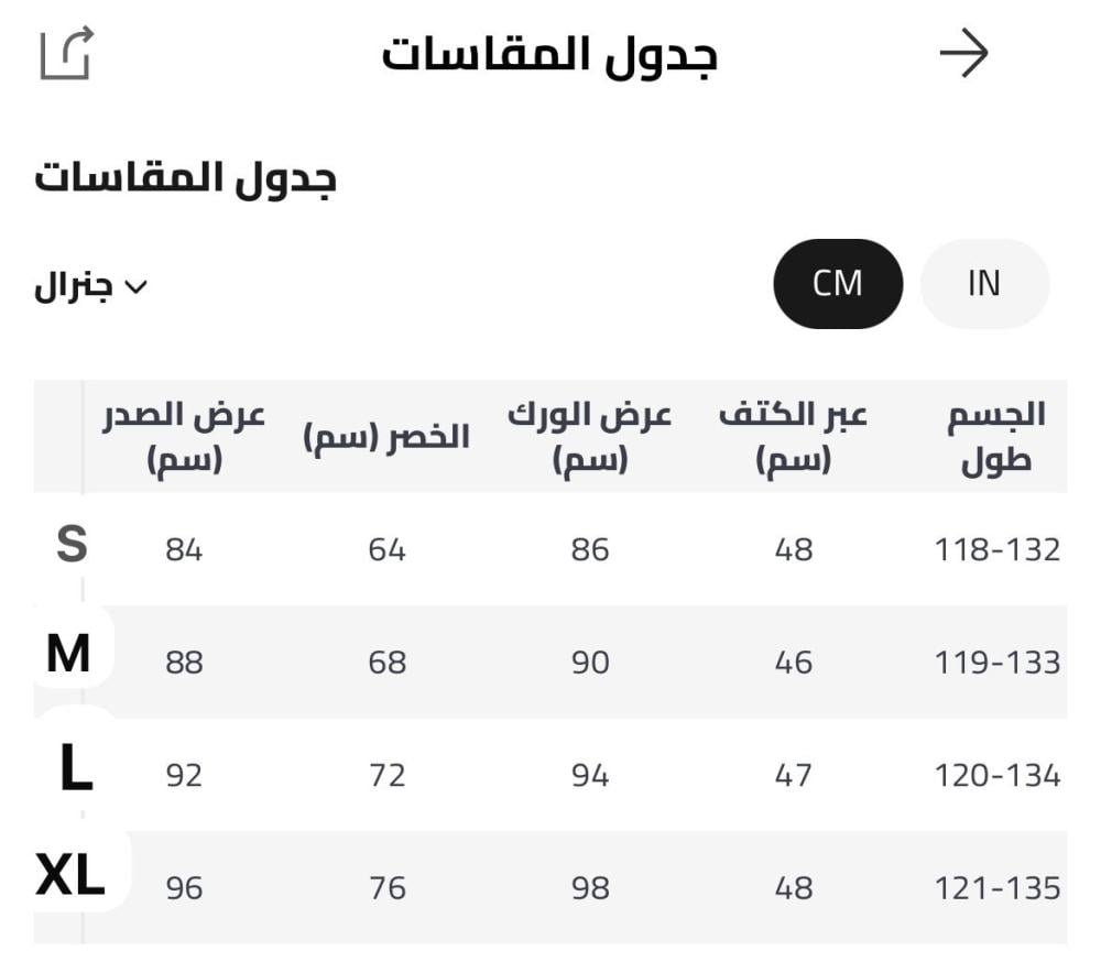 XL الطول: 113 الصدر: 96 الخصر: 78الكتف: الكم: الوركين: